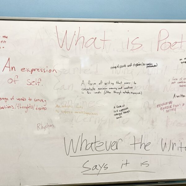 Students gave the usual answers: “an expression of self” and “a form of writing that aims to concentrate maximum meaning and emotion in a few words (often through metaphor, image, ect.).” As I have done hundreds of times, I asked if the group would be willing to know what I think poetry is. The group kindly solicited my opinion, and I wrote on the board “Poetry is whatever the writer says it is.” Of course, this frustrated some of the students. There were eye rolls and challenges of “what if someone thinks poetry is a duck?” Eventually, as often happens, an apt student pointed out “Perception is reality.”